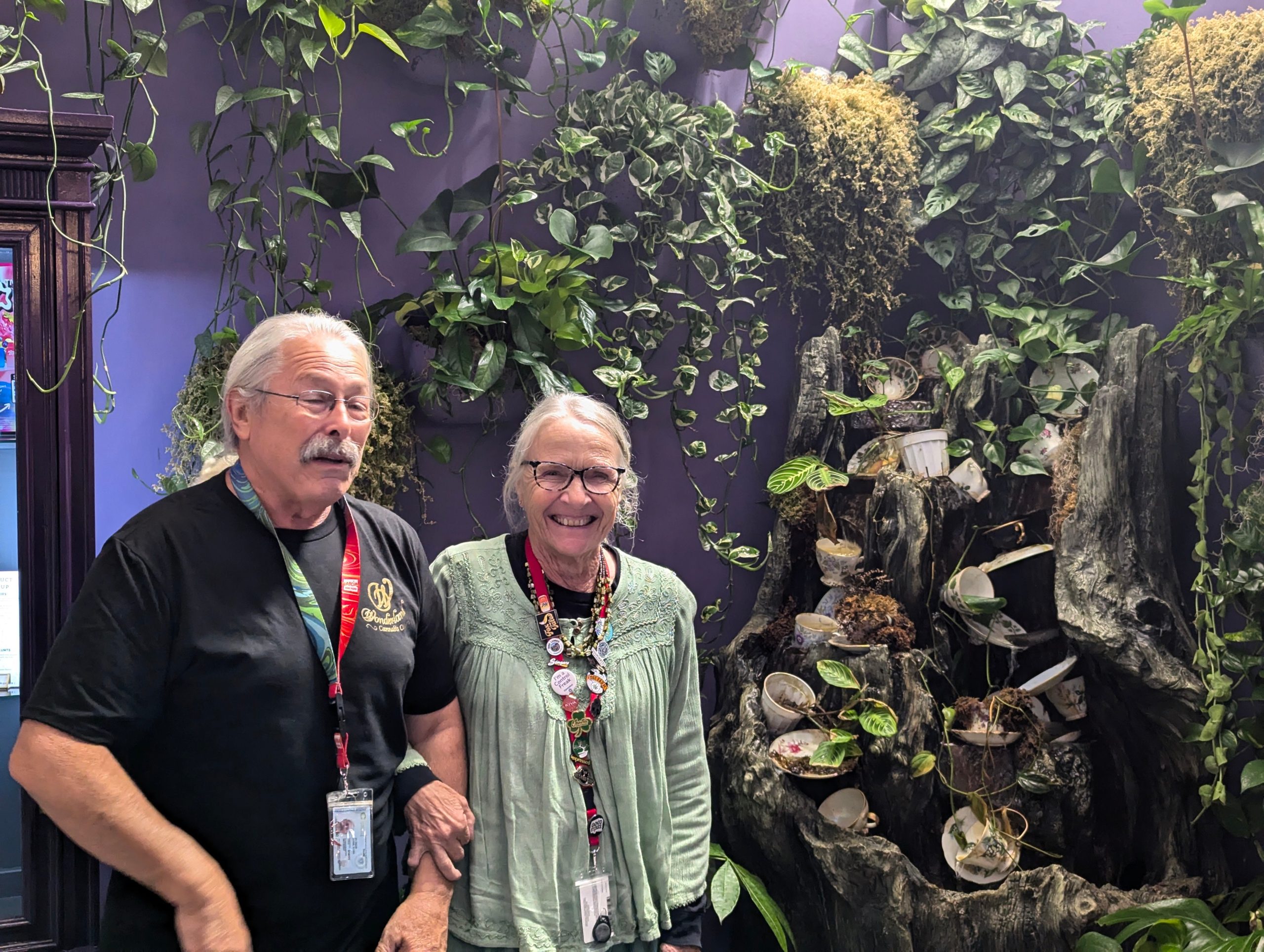 Puffy clouds hang from the ceiling, blending in with the store’s spray-foam ceiling, as a giant mural of The Hatter from Carroll’s classic novel graces the wall. Carol and Michael’s adult children both work for the company, and turning the location from a former auto garage into a modern dispensary was a team effort.