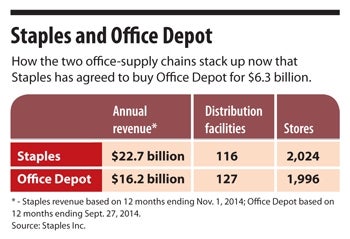 Now, Staples, based in Framingham, is about to buy Office Depot, its chief rival, and consolidate what had been three companies into one giant firm with projected annual revenue of $39 billion. That could be enough to vault Staples into the Fortune 100 and likely make it the top public company based in Central Massachusetts.