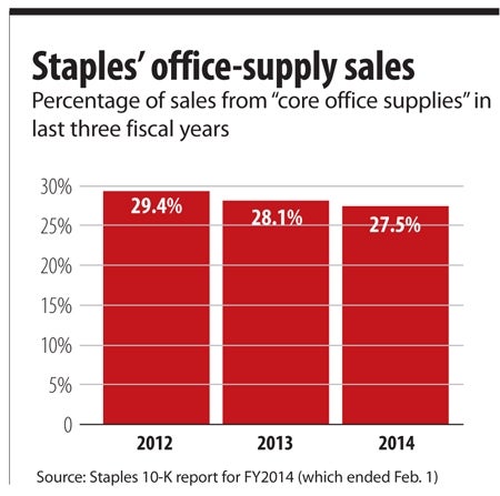 Staples’ travails underscore the power of the Internet as a sales channel and a decreasing reliance by businesses on the company’s traditional office supply products, which over the last two years have fallen as a percentage of Staples’ revenue sources.