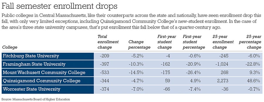 At Mount Wachusett, first-year enrollment this fall is down 26%. A few exceptions to first-year declines exist, most notably at Worcester's Quinsigamond Community College, where freshman enrollment grew by 5%.