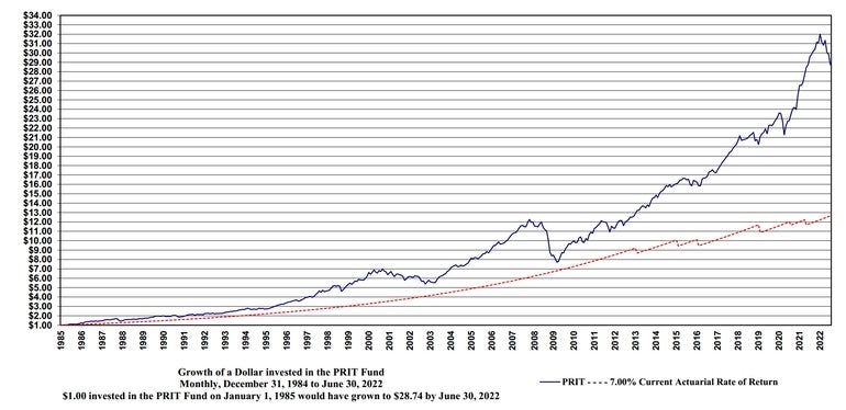 Materials that Trotsky presented to the PRIM board committee meeting Tuesday show that $1 invested in the PRIT Fund on January 1, 1985 would have grown to $28.74 by June 30, 2022.Â