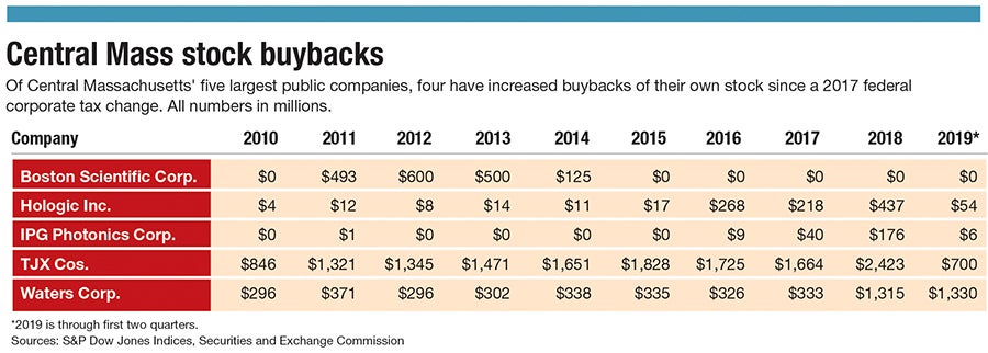 Buybacks among the largest public companies in Central Massachusetts have soared since 2017.