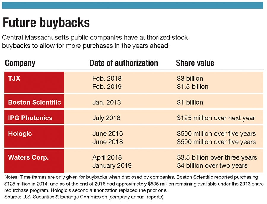 The largest public companies in Central Massachusetts have already authorized more repurchases in the years ahead. In January, Waters approved $4 billion over a two-year stretch.