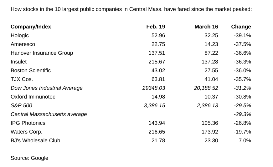 Stock in the 10 largest public companies in Central Massachusetts have plunged 29% in the weeks since the market’s peak, including Monday’s drop of nearly 3,000 points or 13% on the Dow Jones Industrial Average, one of the largest falls in the market’s history.