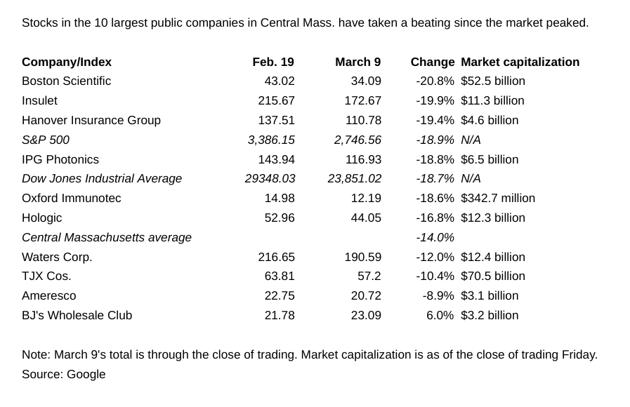 Coronavirus fears that have rocked the American stock market have not spared public companies based in Central Massachusetts.