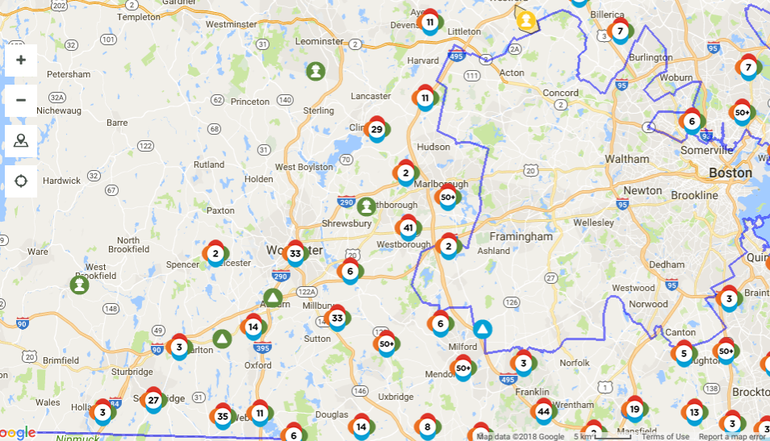 Outages in Worcester County were widespread, with some concentrations in the Blackstone Valley, Milford area, Southborough and Clinton.Â