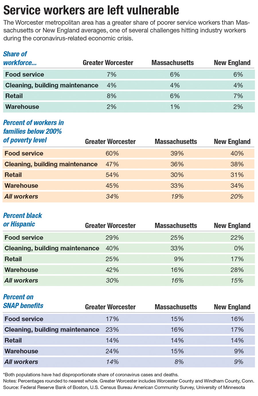 In food service, 60% of workers in the Worcester metropolitan area are in families making 200% or less of the poverty rate, according to a Federal Reserve Bank of Boston report in March. That compares to 39% among food service workers statewide and 34% for all workers in the Worcester area.