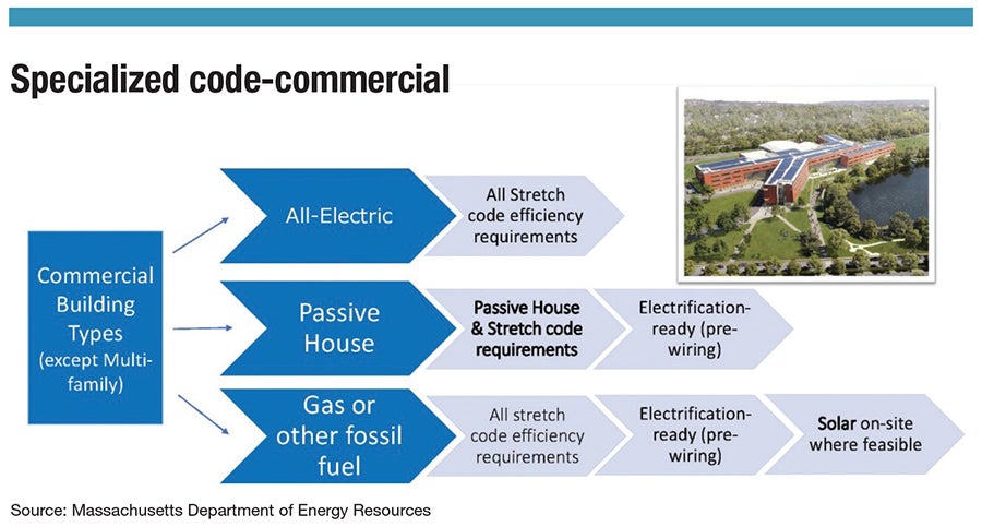 The codes require a residential dwelling of more than 4,000 square feet to be electrified. Multi-family developments in excess of 12,000 square feet must meet passive-house standards. New commercial construction must be either all-electric, meet passive house requirements, and pre-wire for electrification; or if they use a fossil fuel, they must meet all efficiency requirements, be pre-wired for future electrification, and use solar power on-site where feasible. Renovations or additions to existing buildings are exempt from the specialized stretch codes.