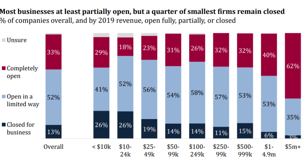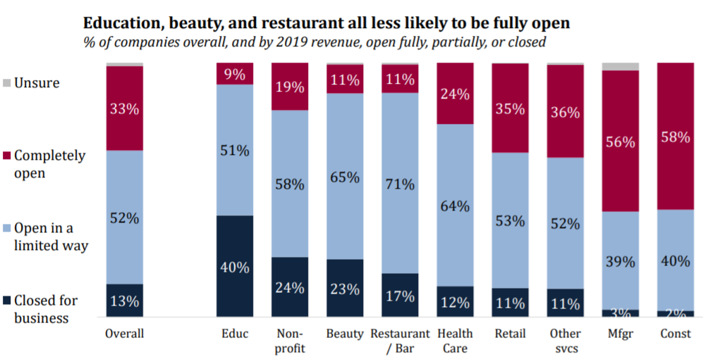 Of the two-thirds that said they weren’t fully open, most said they were open under limited operations. The remaining roughly one-quarter said they were closed for business. Half of those that have closed said they plan to reopen. Most of the rest weren’t sure whether they’d open up again.