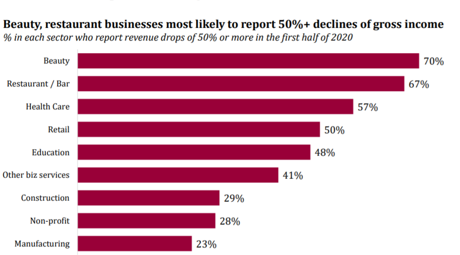 Among industries, the survey found, the hardest hit have been beauty-related, among which 70% said they’ve lost at least half their revenue. Among bars and restaurants, 67% said the same. Two out of five restaurants said they’ve missed rent payments during the pandemic.
