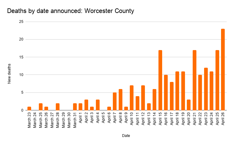 Those 23 new deaths, reported by the Massachusetts Department of Public Health, exceed the previous high mark of 17, which the county reached three times, most recently on Saturday. Almost half the Worcester County deaths so far, 93, have been announced in the past week.