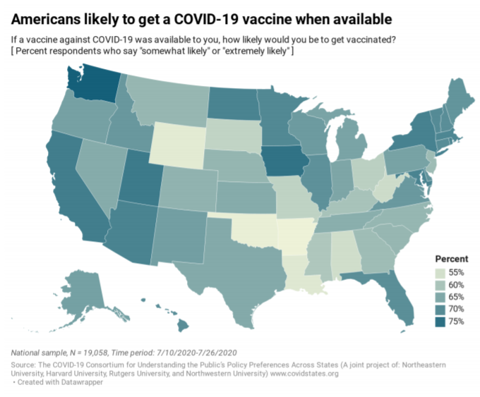 According to a national survey, about two-thirds of American adults say they’re likely to get a vaccine for the coronavirus. In Massachusetts, the rate is 71%, according to a report by researchers at Northeastern University, Harvard University, Northwestern University and Rutgers University.