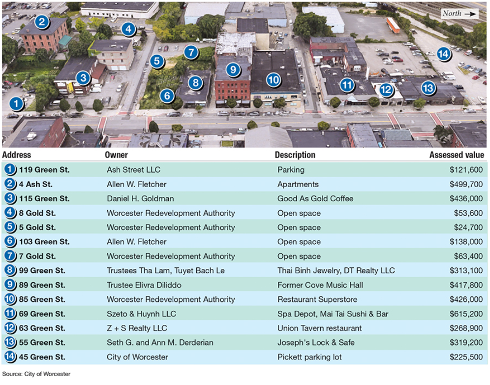 The development would replace four buildings including the Cove, whose site sold in January for $900,000. Others planned to be demolished to make way for the new project include the site of the Thai Binh Jewelry Store and DT Realty next door to the music venue. The addresses are 85, 89, 99 and 103 Green St., as well as 12 Plymouth St., 5 and 7 Gold St. and part of 62 Washington St., all in the same block between Green Street and the Polar Park baseball stadium.