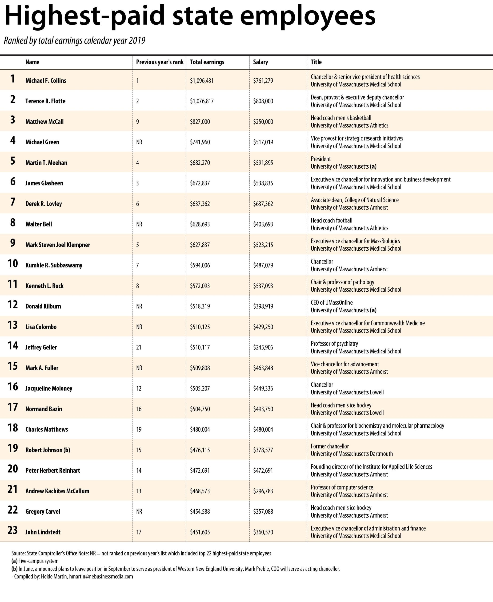 Once again, the highest-paid state employee is Michael Collins, chancellor and vice president of health services at UMass Medical School, who brought home $1,096,431 in 2019, including a salary of $761,279. Collins was also the highest-paid state employee in 2018 and 2017.