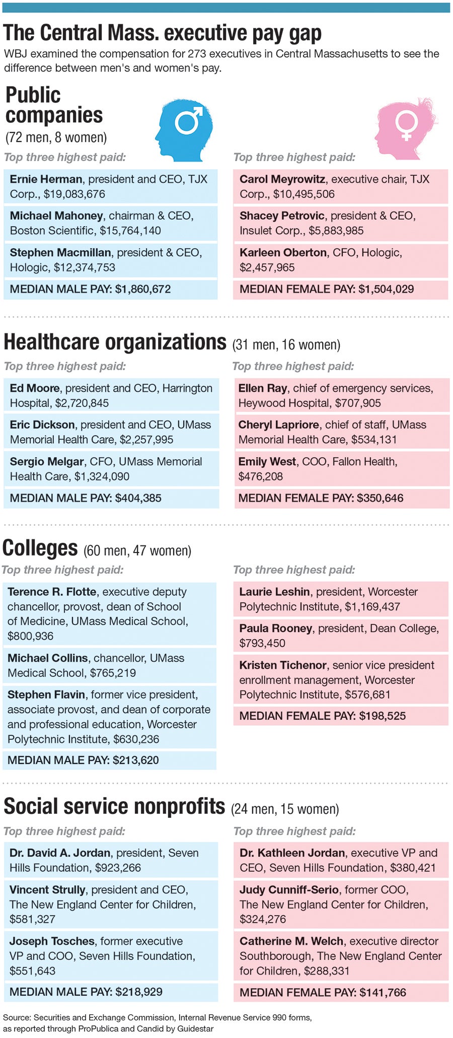 Women’s pay, on average, remains below men at these Central Massachusetts business leadership positions. At Central Massachusetts social service nonprofits, for example, men executives earn a median income of $218,829, whereas women leaders are paid $141,766. The median pay for male leaders at the region’s public companies is $1.9 million, compared to women executives, whose median income is $1.5 million.