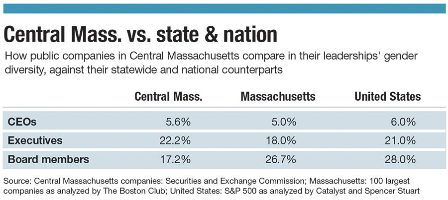 Central Massachusetts outpaces the entire state in having women CEOs at public companies – 5.6% vs. 5% – although both trail the national average at 6%. In having women on boards of directors at those companies, Central Massachusetts (17%) is behind both the state and national averages by 10 percentage points.