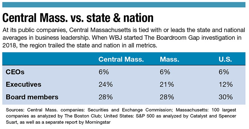 In Central Massachusetts, WBJ found 11 of the companies studied had one woman in their leadership.