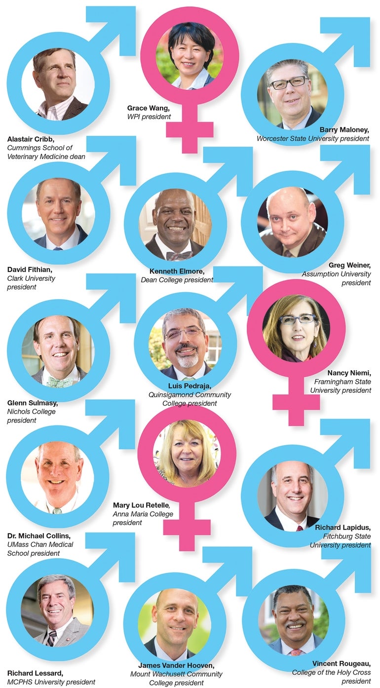 Central Massachusetts has four people of color, or 27%, leading colleges and universities, and one is a woman (Wang).
