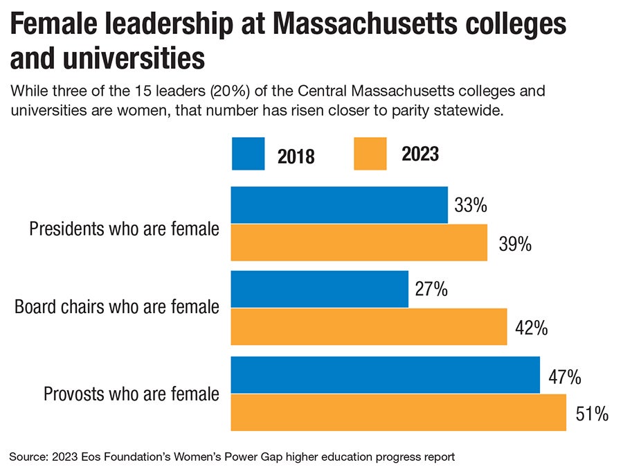 Some 26 higher education institutions in the state have never had a woman president, including five in Central Massachusetts: Assumption University, Clark University, College of the Holy Cross, Fitchburg State University, and UMass Chan Medical School, according to the report.