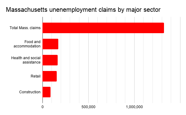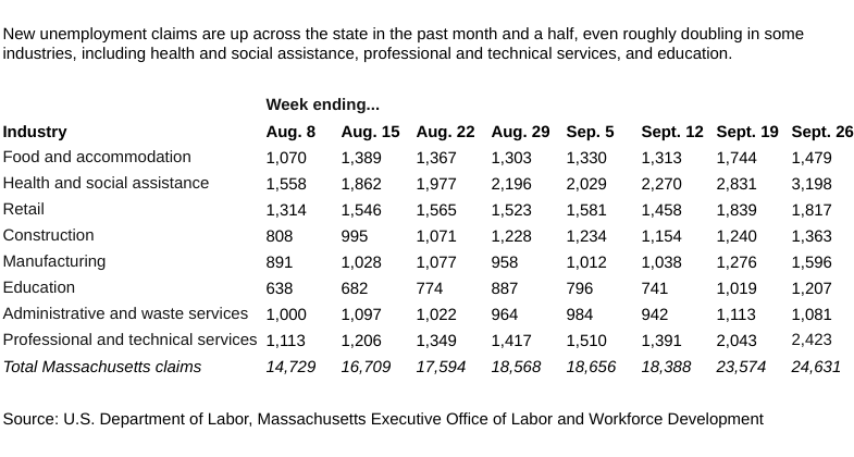 Across Massachusetts, new unemployment claims have jumped in the past seven weeks in some key industries, including professional and technical services and health and social assistance, both whose claims more than doubled in that time, according to the state Executive Office of Labor and Workforce Development. Manufacturing claims were up 79% over that stretch.