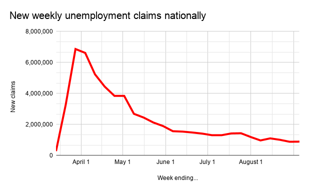 Those worsening numbers from the U.S. Department of Labor come as the nation as a whole has seen initial unemployment claims stay at a flat — albeit very high — rate. A total of 837,000 claims were filed nationally last week, a 14% improvement from 971,000 in the week ending Aug. 8.