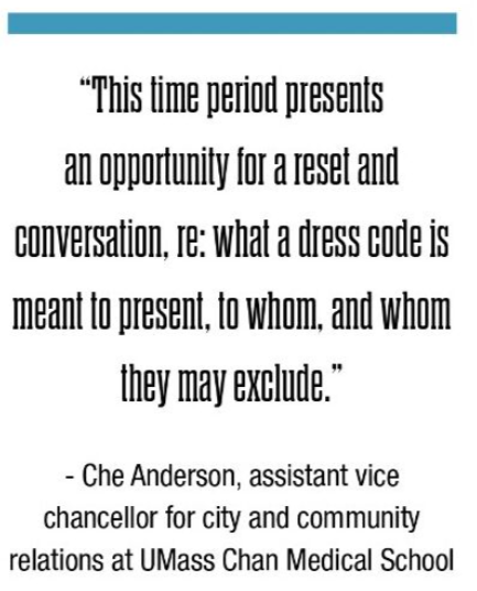 Black, Indigenous, and people of color “often have to reconsider certain hairstyles that would be deemed unprofessional due to biased ideas, and while many still consider a suit and tie to be the standard for business meetings, they can just as easily occur with polos, t-shirts, jeans or sneakers,” said Che Anderson, assistant vice chancellor for city and community relations at UMass Chan Medical School in Worcester.