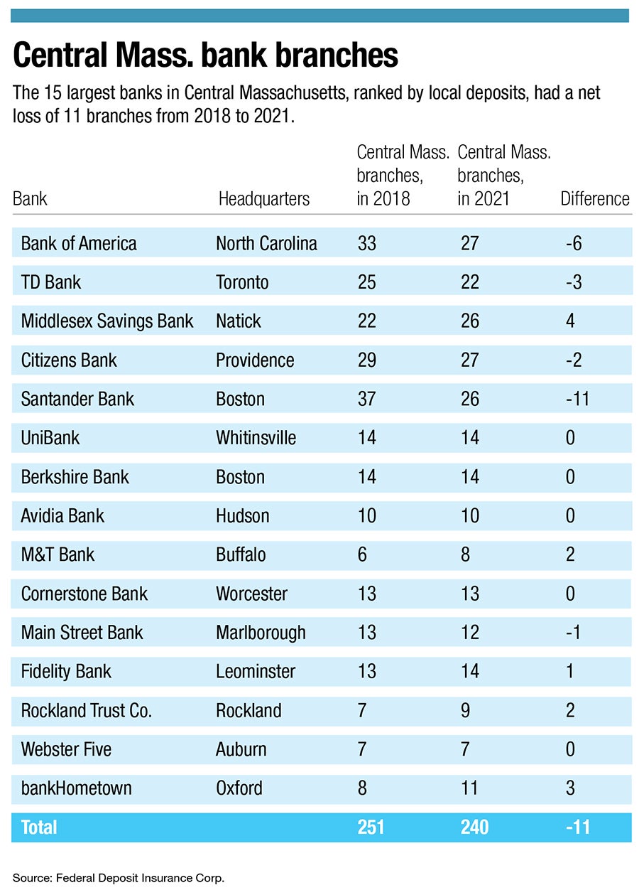 Central Massachusetts has seen some bank branch consolidation, though. From 2018 to 2021, the 15 largest banks in the region, ranked by local deposits, had a net loss of 11 branches, according to a Worcester Business Journal examination of Federal Deposit Insurance Corp. data.