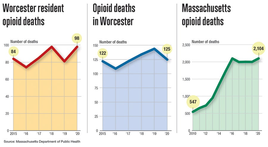 There were 125 overdose deaths in Worcester in 2020 compared to 144 in 2019. However, people from Worcester who died of overdose rose 21% from 81 to 98.