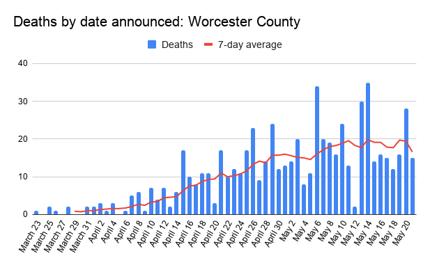 The new deaths in Worcester County increase the tally to 640Â as of Thursday. Throughout Massachusetts, there were 82 new deaths adding to the 6,148 total.