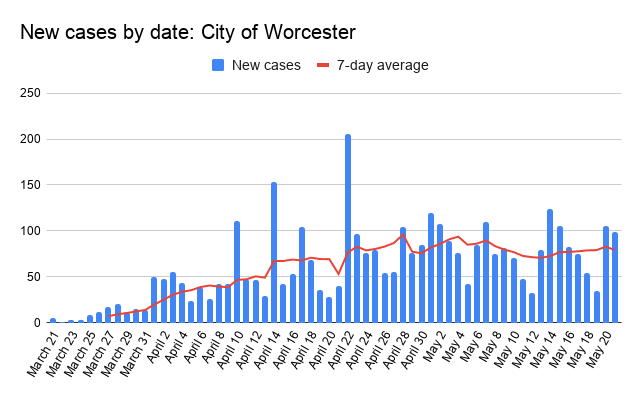 The City of Worcester reported 99 new cases contributing to 3,760 to date.