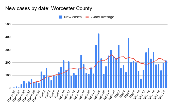 Worcester County recorded 217 new coronavirus cases on Thursday, and the death toll has risen by 15, according to the Massachusetts Department of Public Health.
