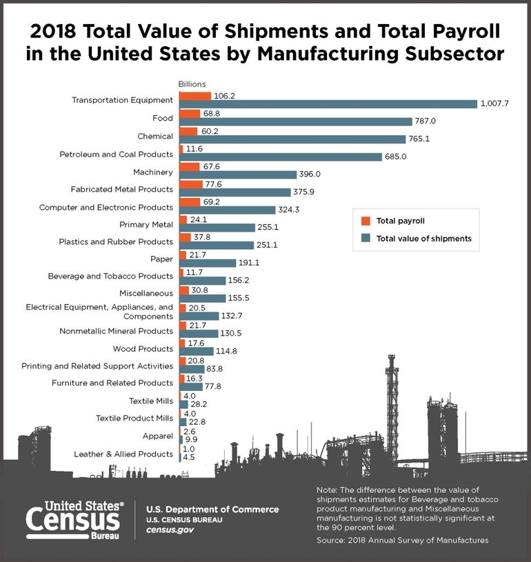 The third largest subsector, according to the same measurements, was chemical manufacturing, which totaled $765.1 billion in shipments and $60.2 billion in payroll.