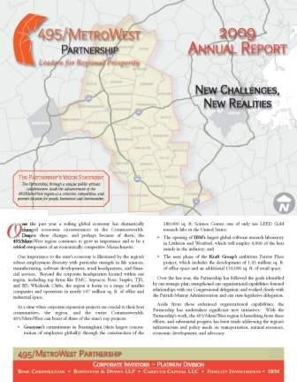 The 495/MetroWest Partnership is public-private organization based in Westborough that advocates for 32 communities along the I-495 corridor. It addresses transportation, water resources, workforce development, housing and permitting issues. Every year it issues an annual report that shows its progress on these issues at its annual June meeting.