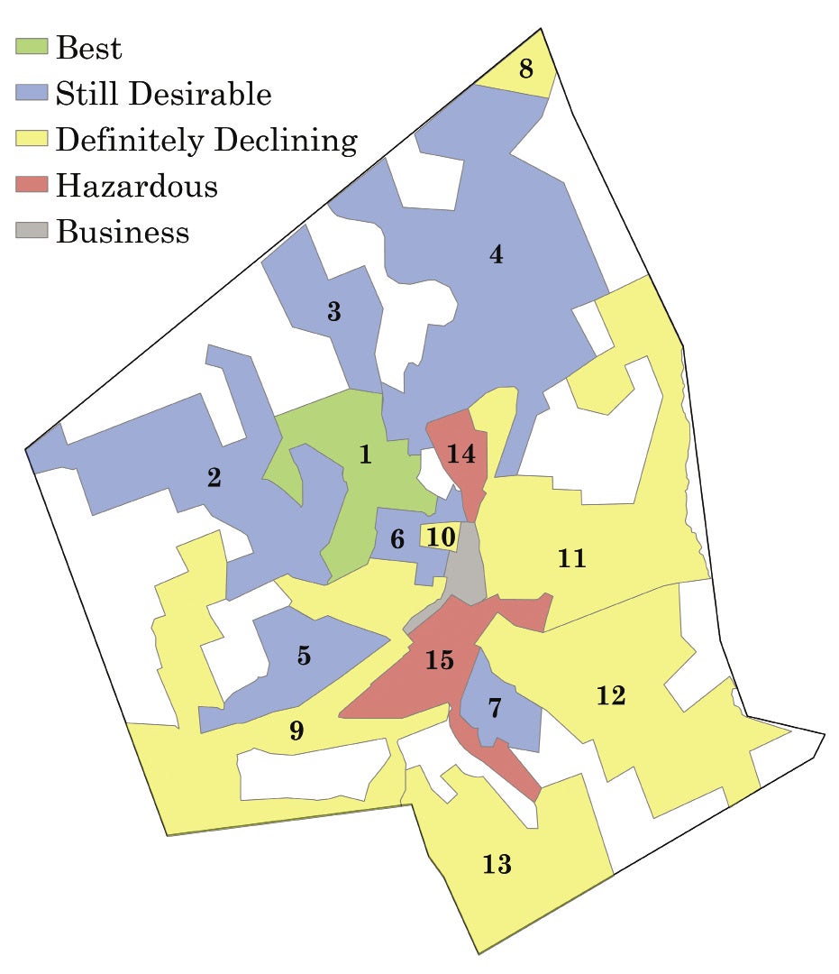 Worcester has gone through many iterations – including plenty of tough times – but its growth, in a lot of ways, has been predictable. It’s a city shaped not only by its hills, but also by a map. Specifically, a realty area map drawn and looked over by seven white men in 1936 with ties to the federal government, and the city’s banking and real estate industries. The map was commissioned by the Home Owners' Loan Corp. and used problematic – and, in some cases, downright racist – criteria to classify the city into five areas: Best, Still Desirable, Definitely Declining, Hazardous, and Business.