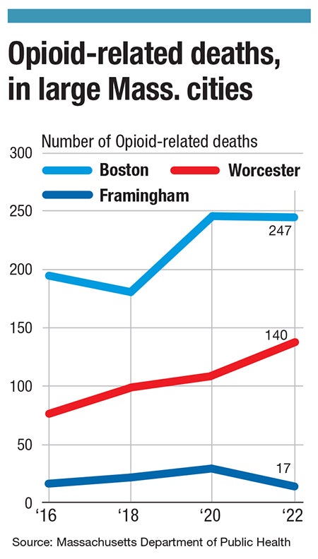 Within the city of Worcester, there has been an even greater increase in deaths. The city saw 140 opioid-related deaths in 2022, a 33.3% increase since the year prior. It is the highest total number of opioid-related deaths in the city for a single year, according to DPH data.