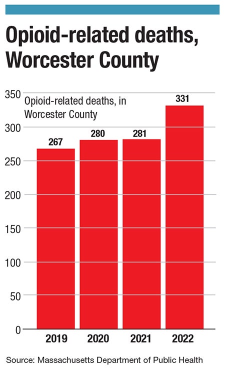 In Worcester County, opioid-related deaths increased by nearly 20% from 2021 to 2022, one of the largest upticks across Massachusetts, and one of the largest bumps up in the past 10 years. In the county, 331 individuals died from opioid-related causes in 2022, the largest number in the past 10 years of data from the Massachusetts Department of Public Health.