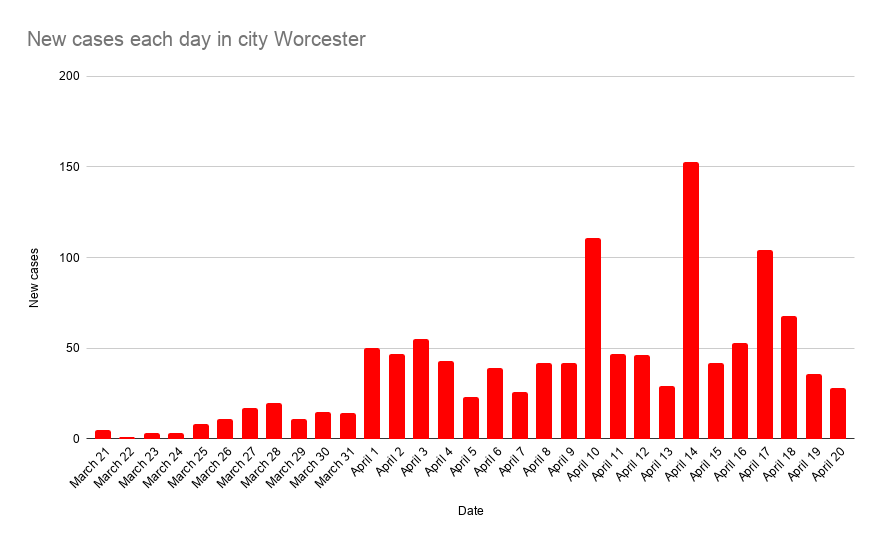 The City of Worcester reported 1,239Â total cases Tuesday, up 40, or 3%, in one day.