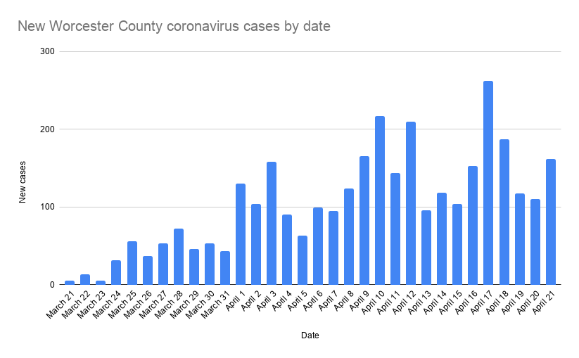 In Worcester County, cases rose in a single day by 162, or 5%, to 3,341. That was the sixth highest single-day total for the county so far.