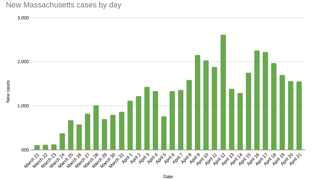 Those 17 new deaths were a share of 152 new deaths statewide announced Tuesday by the Massachusetts Department of Public Health, bringing the statewide death toll to 1,961. Total statewide cases were up 1,556, or 4%, to 41,199.