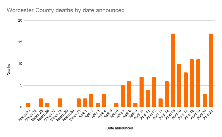 Worcester County had 17 newly reported coronavirus deaths Tuesday, tying the county’s single-day high and bringing the total so far to 133.