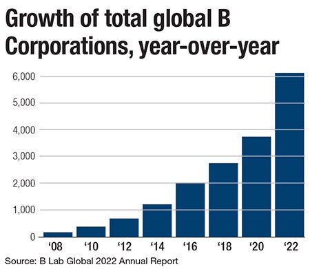 Since the first 82 companies were B Certified in 2007, the movement has exploded globally. In 2022, there were 6,123 B Corps, up from 4,427 the previous year, according to the B Lab 2022 Annual Report.