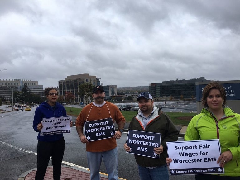 Paramedics and EMTs for UMass Memorial Medical Center picketed outside of the hospital on Plantation Street on Tuesday after contract talks fell through on Friday.