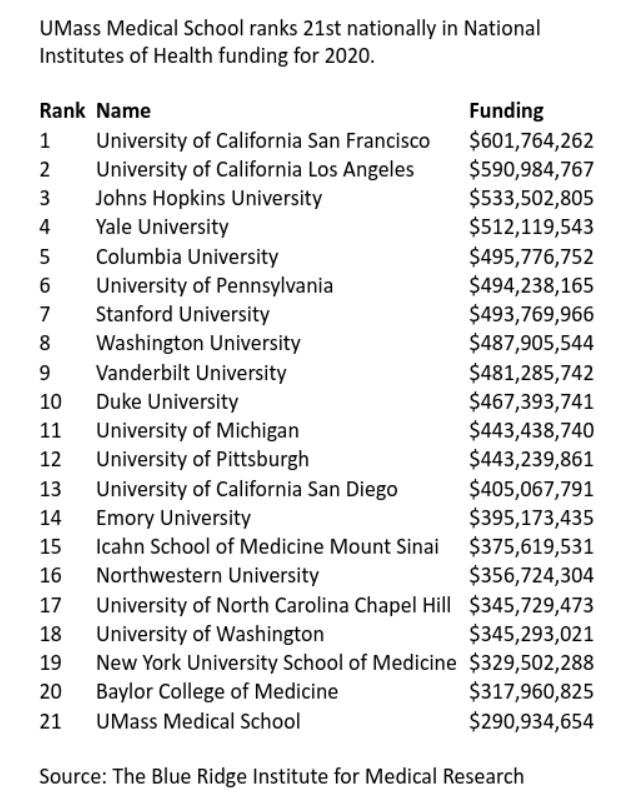The Worcester school was 21st on the new list from the Blue Ridge Institute for Biomedical Research in North Carolina, up from 38th a year ago. UMass, which announced the new ranking Wednesday, was surpassed in New England only by the Yale School of Medicine, bringing in $291 million from the National Institutes of Health. Harvard Medical School received $170 million.