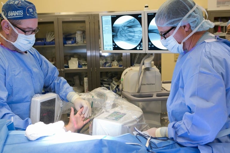 UMass Memorial surgeons can now use the OEC Elite MiniView C-arm from GE Healthcare during diagnostic and therapeutic treatments, and for surgical procedures of the limbs, extremities or shoulders, according to the hospital. The $80,000 X-ray’s dual flat panel monitors with high-resolution imaging technology allows surgeons to look at small bones in much greater detail, making it easier to spot things like small fractures or tumors. It arrived last week was used for the first time on Monday.Â