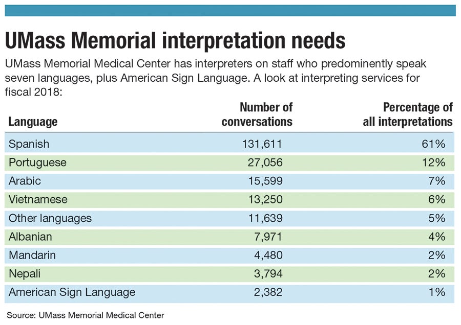 At UMass Memorial Medical Center’s three Worcester campuses, the number of patients who don’t speak English fluently has rose 22% in the past five years.