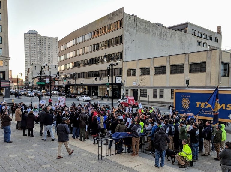 The Worcester rally included members of the Teamsters, SEIU (Service Employees International Union) and AFSCME (American Federation of State, County and Municipal Employees).