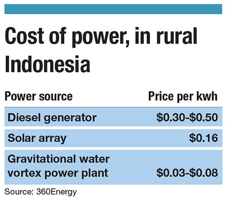 Based on Rifky and Slamet’s research and through the WPI Tinkerbox program, 360energy developed a system called the Guppy, a gravitational water vortex power plant producing 2 kilowatt hours of electricity, enough to run a fish farm’s aeration system, refrigeration, and lights, along with two or three other homes.