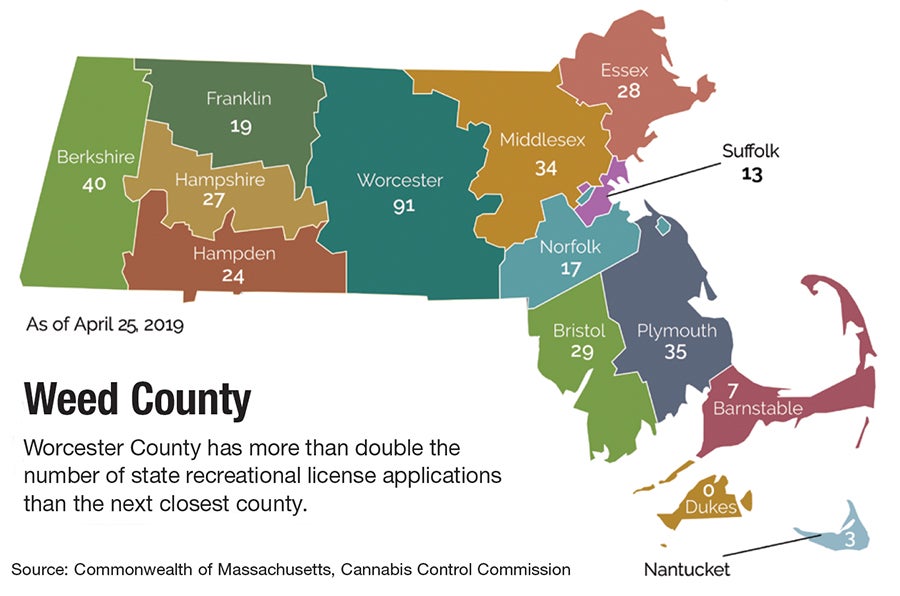According to CCC data, Worcester County had 91 applications for a marijuana business license at the end of April, more than double the next highest region in Berkshire County with 40.