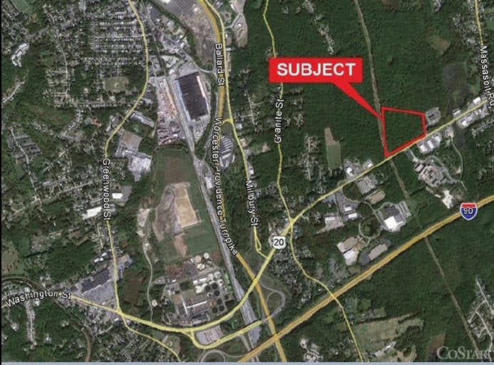 The property is adjacent to a building housing Royale Care and Teamsters Local 170, and across from Howard Glass. It abuts Broad Meadow Brook conservation land owned by Mass Audubon.