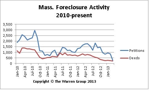 Lenders filed 284 petitions to foreclose in Massachusetts in March, an 82 percent decrease from the March 2012 number of 1,621, The Warren Group said. In the first quarter, 2,080 petitions were filed in the state, down 52 percent from 4,348 in the first quarter of 2012.